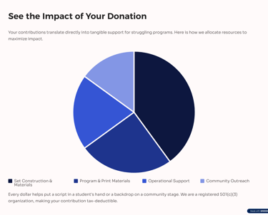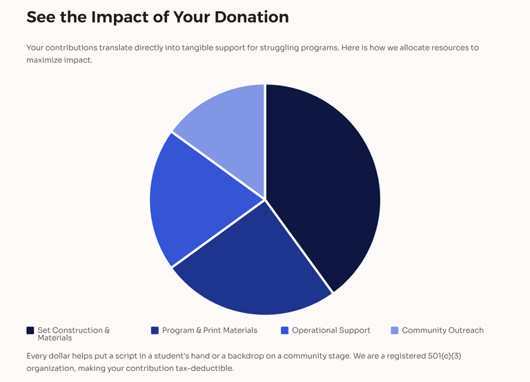 Our mission is to enrich and empower schools and nonprofit organizations by providing versatile support for their artistic, musical, athletic, and educational endeavors. We are committed to offering a helping hand in the form of digital and print materials, direct financial assistance, and educational resources that foster creativity, inclusivity, and growth. Our goal is to ensure that every program we touch—whether in theater, music, sports, or academics—has the resources they need to thrive and inspire their communities.
